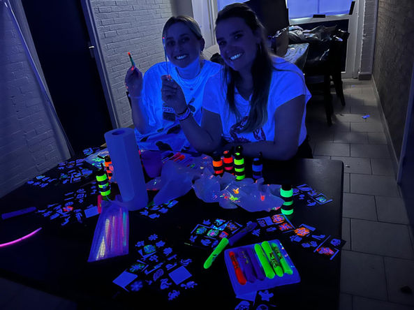 Da wir mittlerweile erprobt waren in jeglicher Form des Tanzbeinschwingens, durfte auch eine weitere Variante dieses Vergnügens nicht fehlen: die Schwarzlichtdisco. Nach der Messe wurde der große Saal kurzer- und vor allem langer Hand beschwarzlichtröhrt und die Tanzfläche poliert. Wie auf den Bildern zu sehen, entstanden die unterschiedlichsten Farbspiele. Ein grandioser Anblick. Verfeinert mit dem ein oder anderen Leuchttattoo wurde bis 22.30 Uhr und dem klassischen Abschlusslied "Kinder von Ameland" gerockt, dass die berühmte Heide wackelt.